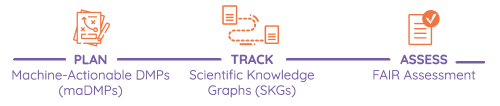 The Plan-Track-Assess framework comprises three main components: Data Management Planning platforms, Scientific Knowledge Graphs, and FAIR assessment tools. This Framework, highlighted in D1.1. Plan-Track-Assess Pathways, describes the key pathways — blueprints that illustrate the interactions between the three main components.